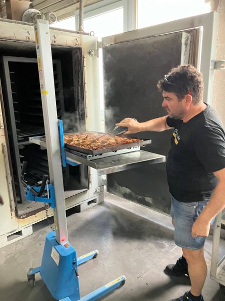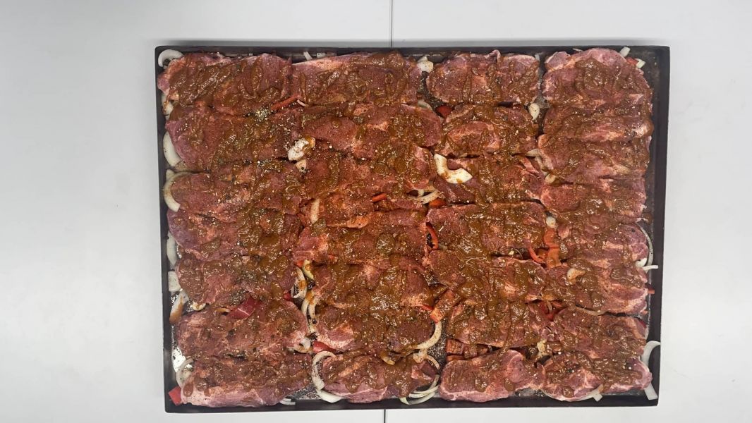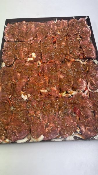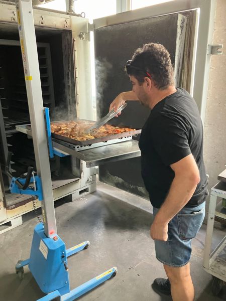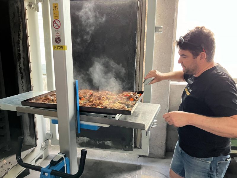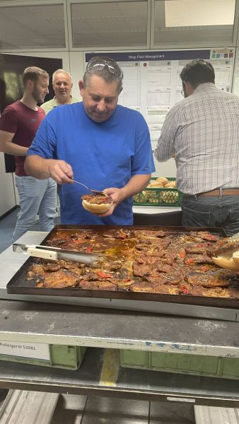BBQ-Fleisch nach Schichtfleisch-Style mit Gemüse und BBQ-Sauce. Aus Willy´s Hochofen im Brötchen serviert.