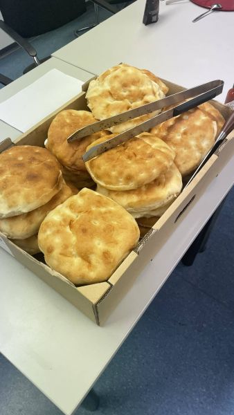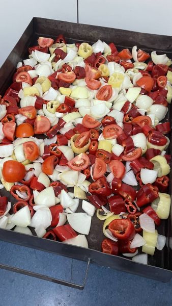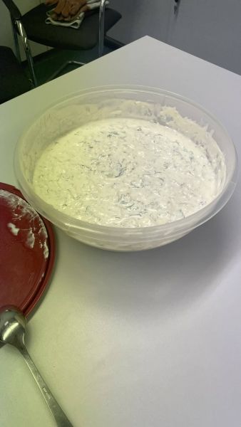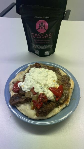 Gyros-Fleisch nach Schichtfleisch-Style mit Gemüse und JASSAS!. Aus Willy´s Hochofen im Brötchen serviert mit Tzatziki.