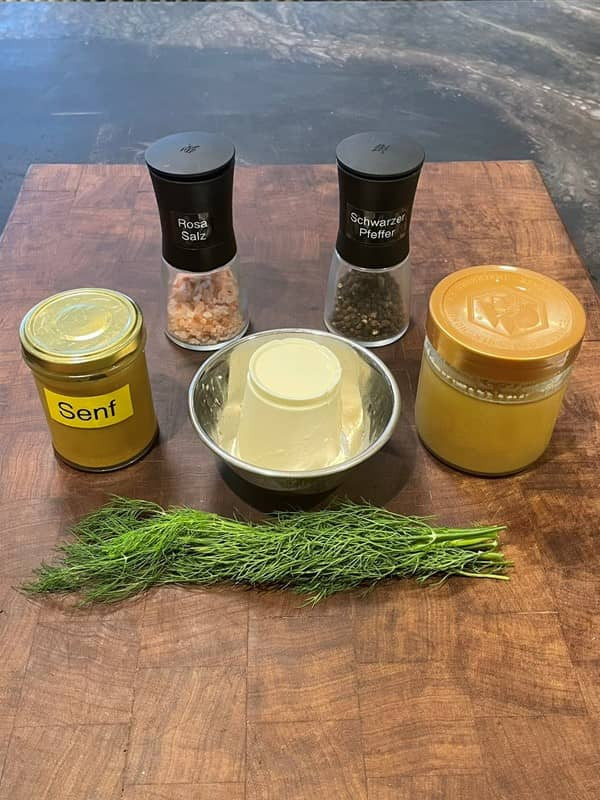 - Honig, Senf und Dill dazu geben