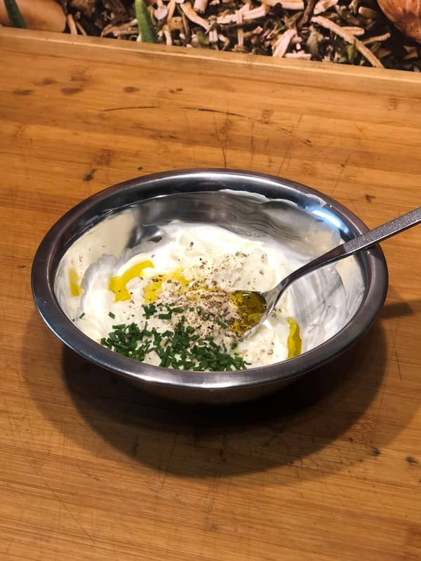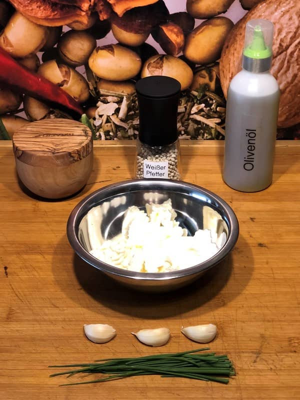 - Olivenöl und Schnittlauch dazu geben