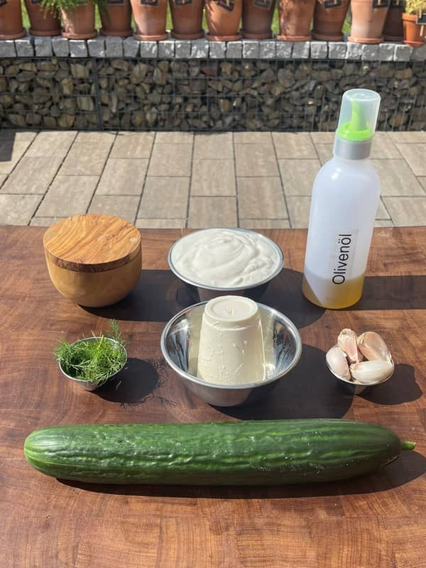 Meine Interpretation des Gurken-Dips. "Tzatziki" ist eine erfrischende griechische Sauce. Griechischer Joghurt wird mit fein gehackter Gurke, Knoblauch, Olivenöl und frischen Kräutern wie Dill oder Minze gemischt. Diese kühlende Sauce wird oft zu Gyros, Souvlaki oder als Dip für Gemüse serviert und verleiht den Gerichten einen cremigen, würzigen Geschmack.