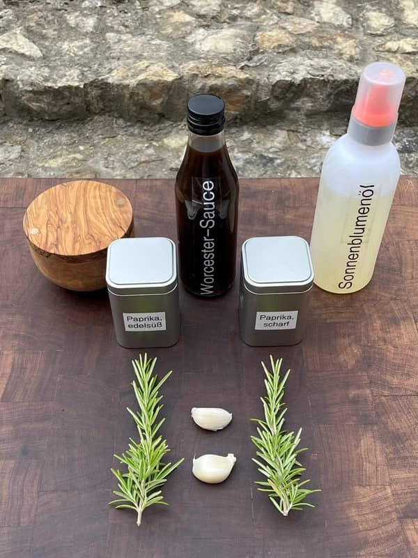 - Öl und Worcestersauce darüber träufeln