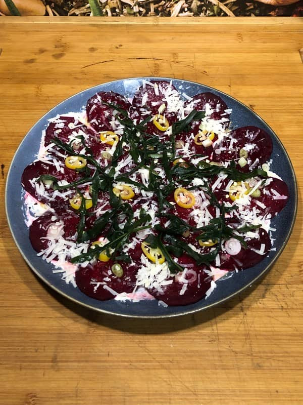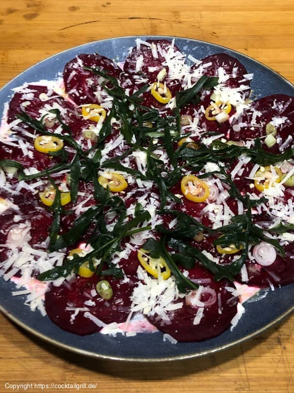 Inspiriert von Steffen Henssler. Rote-Bete-Salat ist eine erfrischende Hauptspeise, Beilage oder Vorspeise, die aus gekochten roten Beten besteht, die in dünnen Scheiben geschnitten und mit einer würzigen Vinaigrette aus Essig, Öl und Gewürzen mariniert werden. Er kann mit Zutaten wie Ziegenkäse, Walnüssen oder Orangenstücken verfeinert werden.
