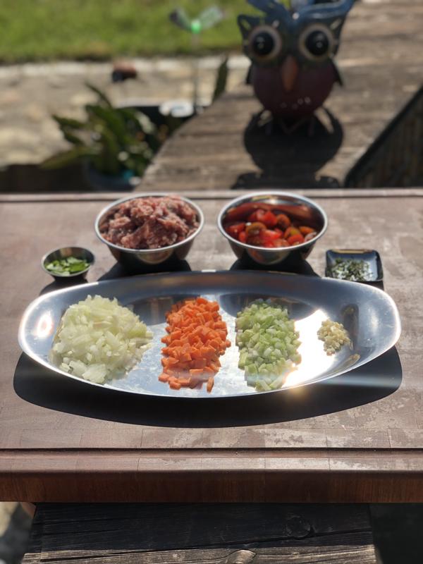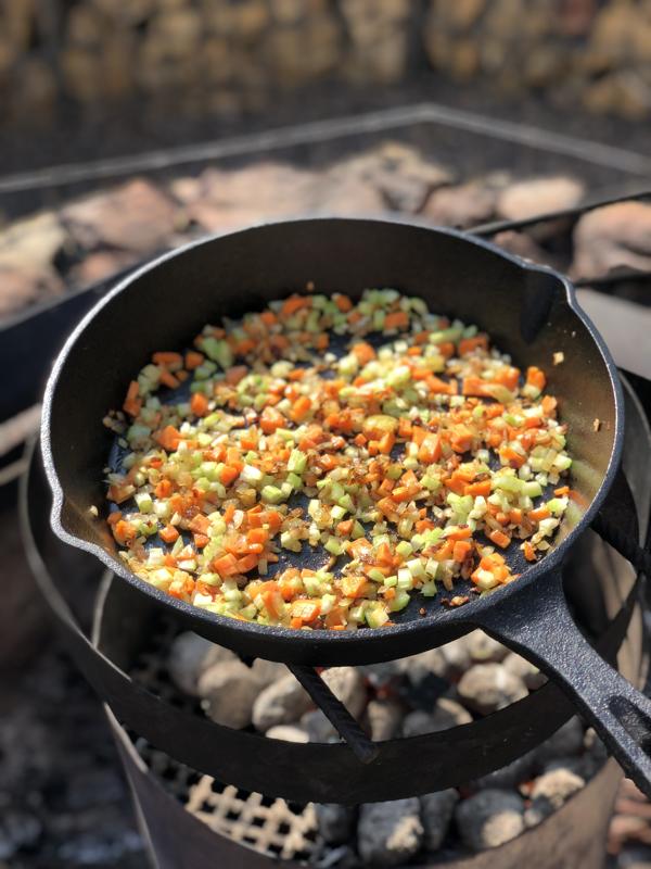 - Zwiebel, Karotte und Sellerie fein zerkleinern