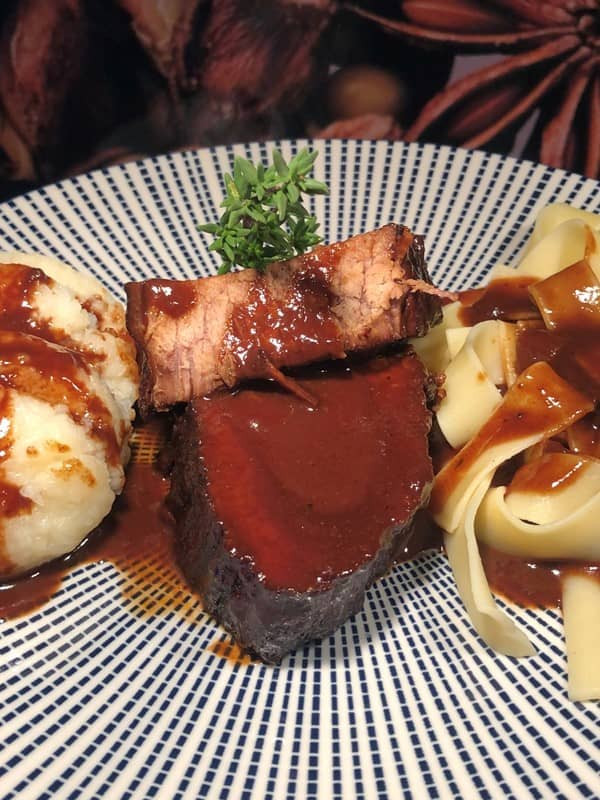 - Rinderbraten in Tranchen schneiden und in der Soße aufwärmen