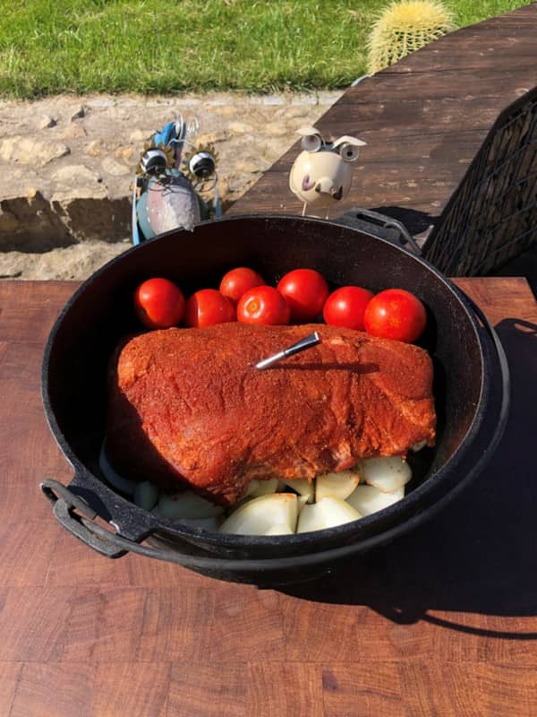 - Dutch Oven mit Zwiebel und Tomaten auslegen