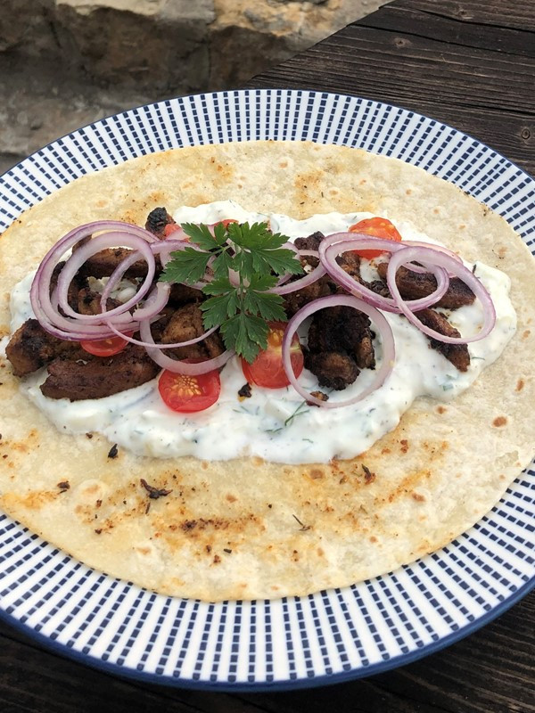 - Pitabrot mit Tzaziki einstreichen und Fleisch auflegen