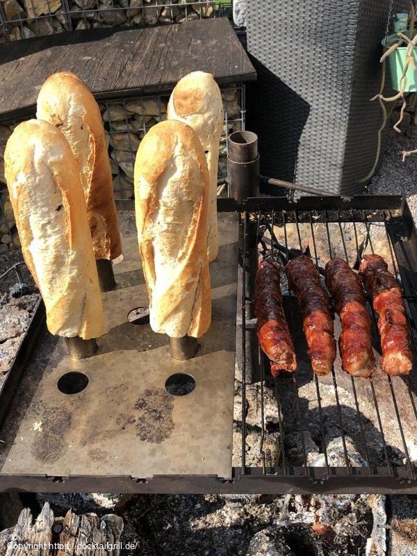 - Baguettehälften vorsichtig auf den Grillstab stecken