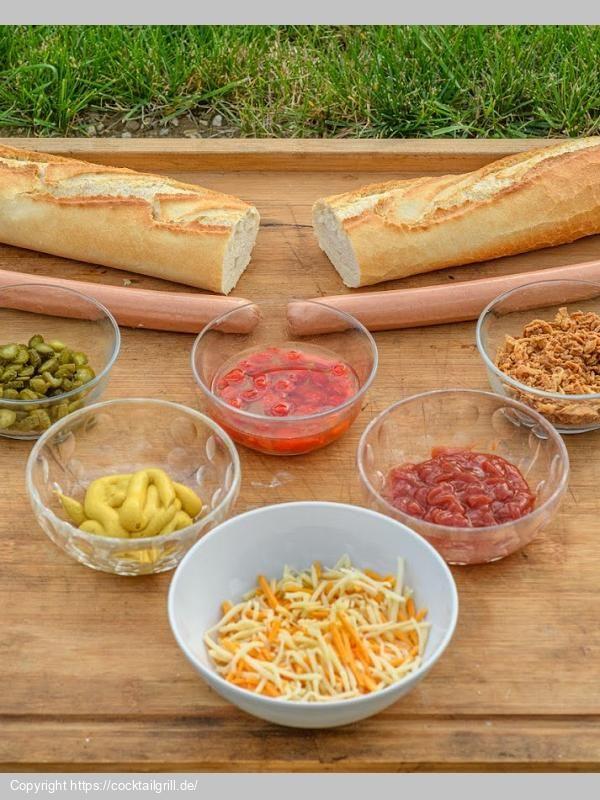 Der Klassiker von der Feuerstelle. "Hot Dog" ist ein amerikanischer Klassiker. Eine Wurst, oft aus Rind oder Schwein, wird in einem Brötchen platziert und mit verschiedenen Belägen wie Senf, Ketchup, Zwiebeln und eingelegten Gurken garniert. Dieses schnelle und beliebte Fast-Food-Gericht ist bekannt für seine Vielseitigkeit und Einfachheit.