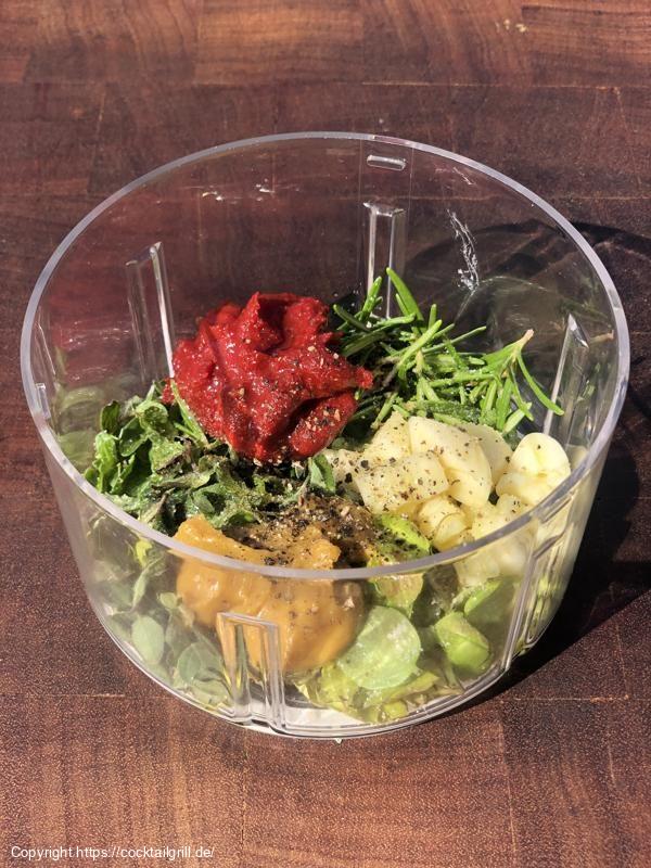 - Rosmarin, Oregano und Thymian vom Stiel zupfen
