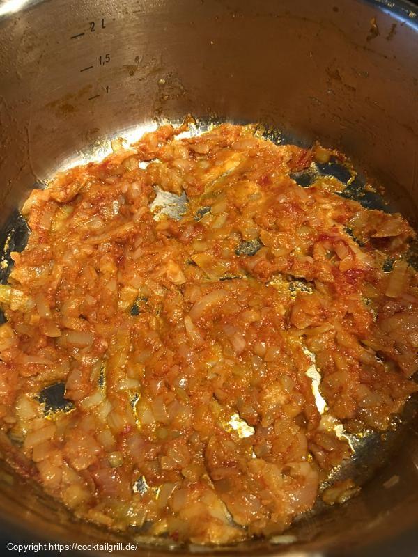 - Knoblauch hinein pressen, Tomatenmark dazu geben und kurz mitrösten