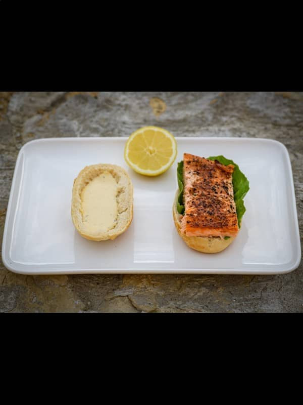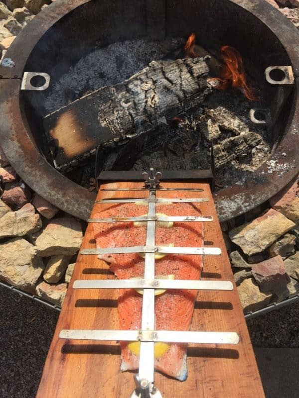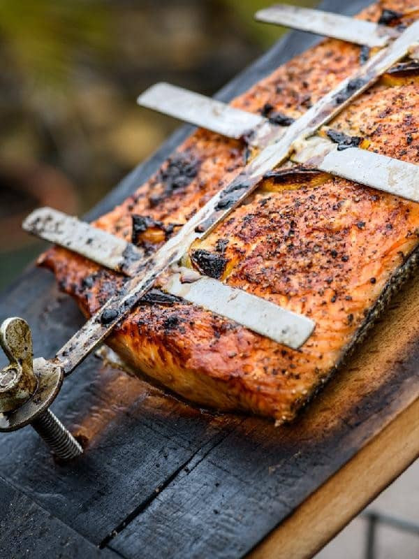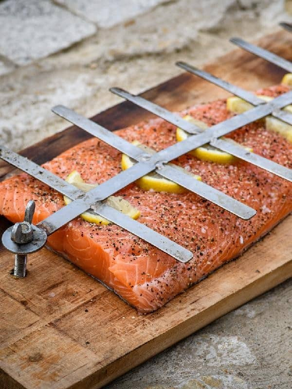 - Zitronenhälfte zwischen Lachs und Fischgrätenhalterung legen