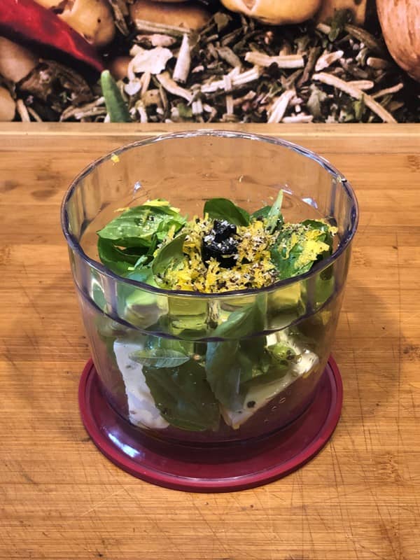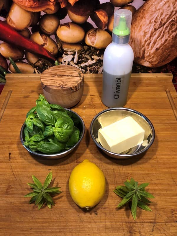 - Basilikum- und Zitronenminzeblätter zur Butter geben