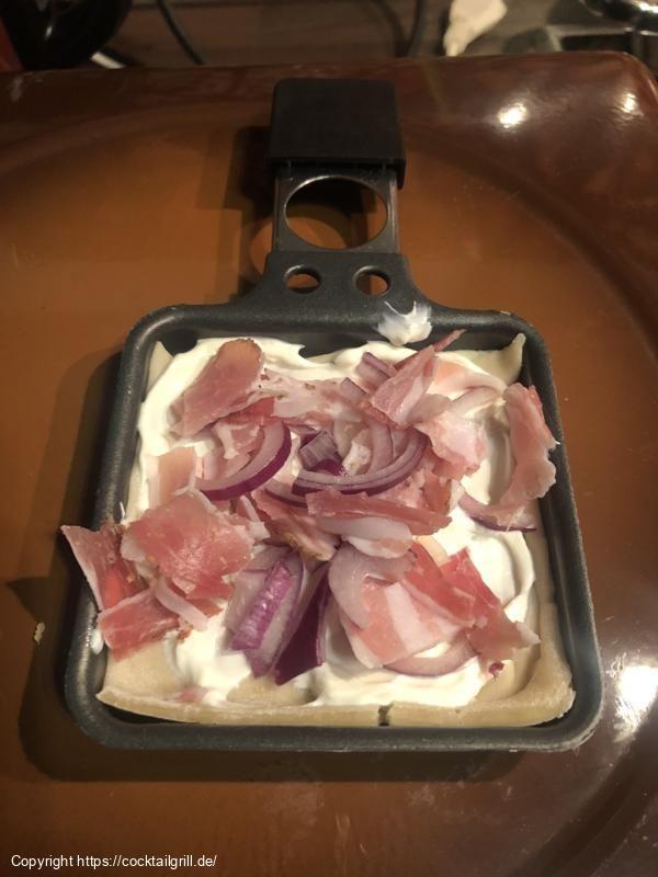 Eine weitere unübliche Varianbte aus dem Raclette. "Mini-Flammkuchen" sind kleine, handliche Versionen des klassischen Elsässer Flammkuchens. Ein dünner Boden aus Teig wird mit Crème fraîche, Zwiebeln und Speck belegt und knusprig gebacken. Ideal als Fingerfood oder Vorspeise, bieten sie herzhaften Genuss in praktischer Größe.