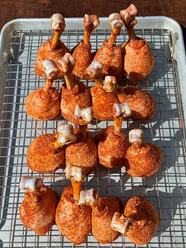 - Hähnchenunterschenkel ca. 1/3 von oben einschneiden und Oberteil entfernen
