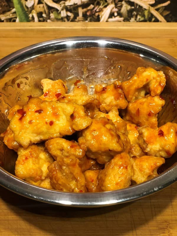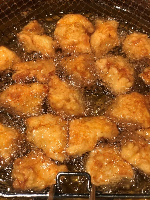 - Ggf. in mehreren Chargen das Hähnchen 10 min fritieren