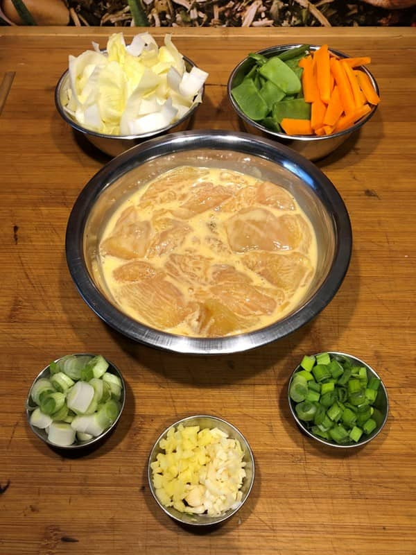 - Hähnchen darin marinieren und für ca. 2 Stunden abgedeckt in den Kühlschrank stellen