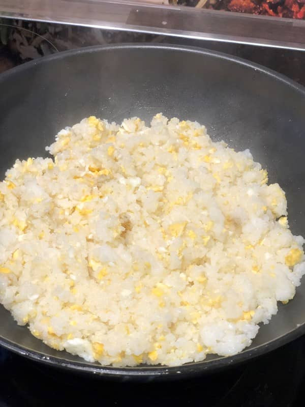 - Kurz bevor die Spiegeleier fertig sind, den Reis dazu geben