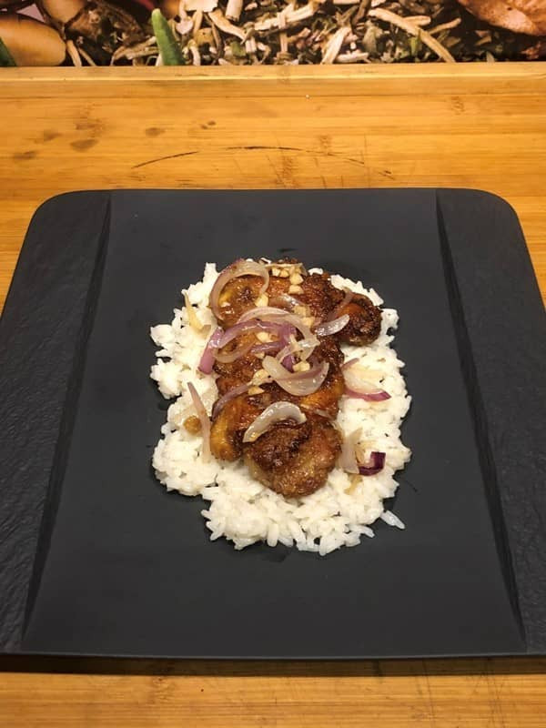 Diesmal sehr nach dem original in Asien angelehnt. "Chicken Thighs" auf Reis ist ein köstliches Gericht. Zartes Hähnchenfleisch wird knusprig gebraten und mit gebratenen Zwiebeln und einer würzigen asiatischen Sauce glasiert. Serviert auf duftendem Reis, bietet es eine perfekte Kombination aus Texturen und Aromen.