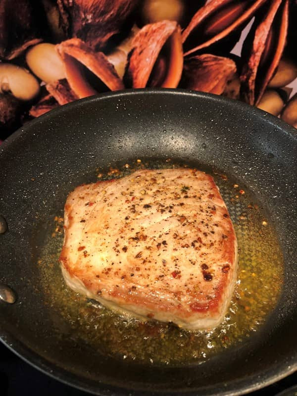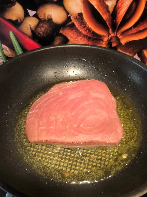 - In der zweiten Pfanne das Thunfischsteak in Olivenöl kurz anbraten