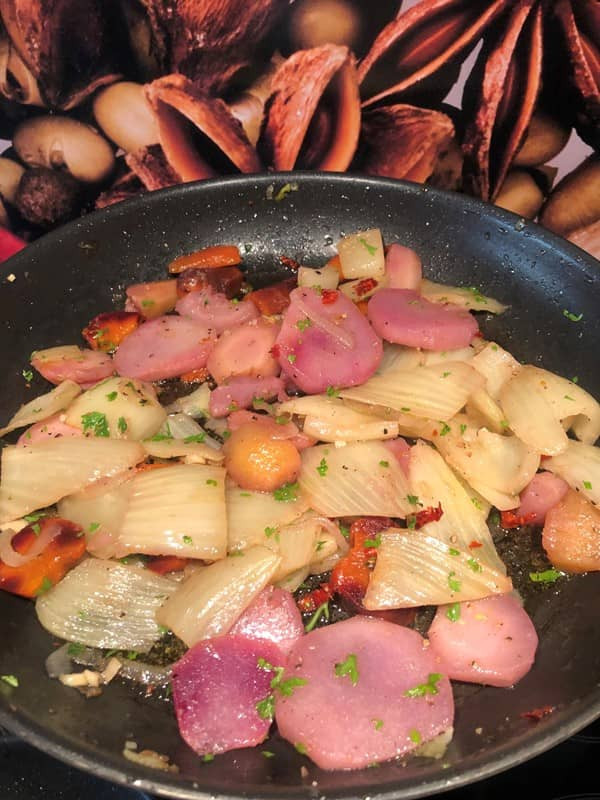 - Zwiebel, Fenchel und Karotten in mundgerechte Stücke schneiden