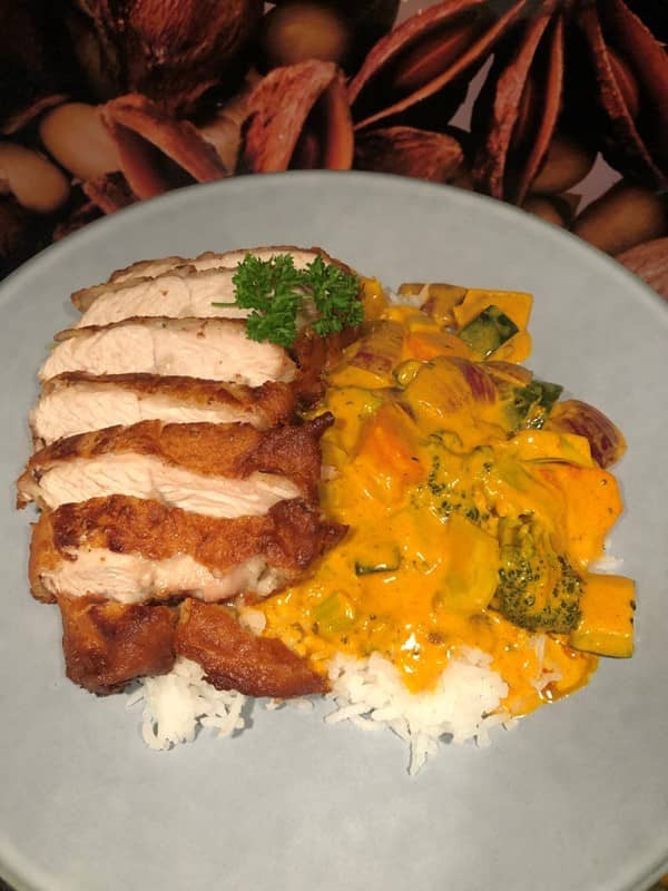 Erster-Versuch-Rezept, dass ich wohl nie wieder hinbekomme. "Turkey Curry" ist ein würziges Gericht, das saftige Stücke von Truthahnfleisch in einer reichhaltigen Sauce aus Kokosmilch, Currygewürzen und aromatischen Kräutern vereint. Es wird oft mit Reis serviert und bietet eine exotische Geschmackserfahrung.