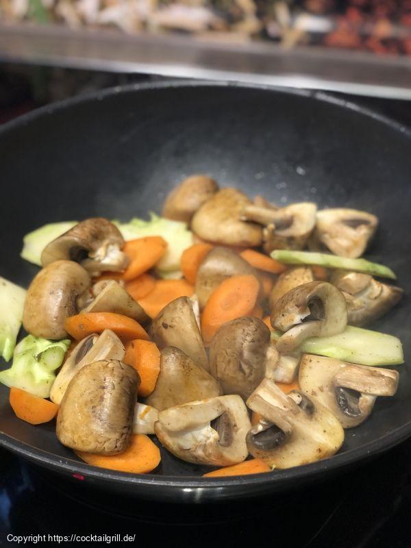 - Dann Pilze, Lauch und Frühlzingszwiebel mit anbraten