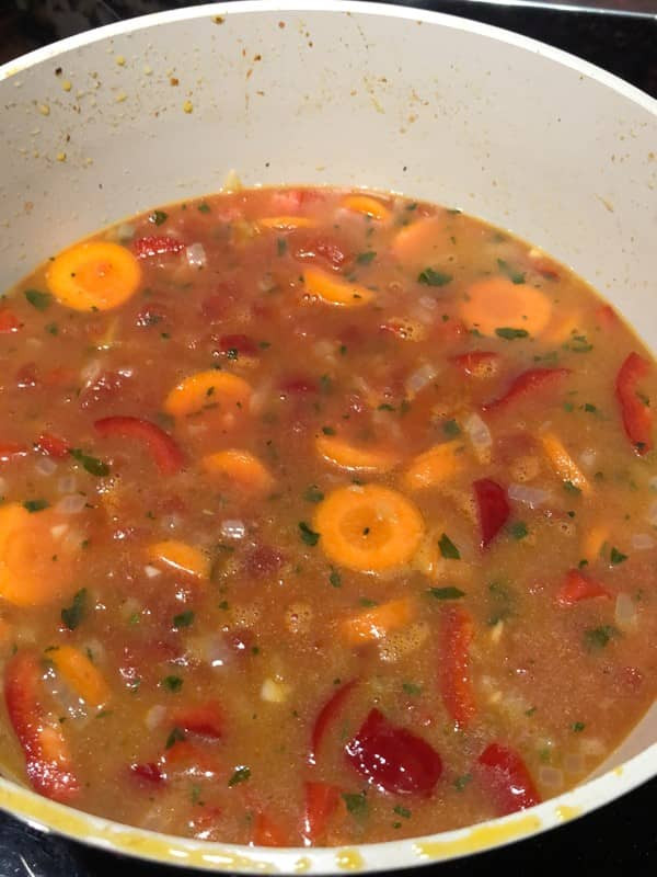 - Stückige Tomaten und Hühnerbrühe dazu geben