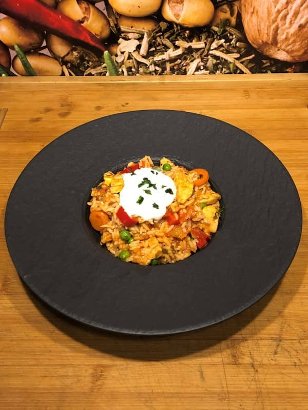 Meine Interpretation vom serbischem Djuveč mit Hähnchenfleisch. "Chicken Djuveč" ist ein traditionelles Gericht aus dem Balkan, das aus saftigem Hühnerfleisch, Reis, Paprika, Tomaten und verschiedenen Gewürzen zubereitet wird. Es wird in einem Topf geschmort und hat eine reichhaltige Textur sowie ein köstliches Aroma durch die Kombination der Zutaten.