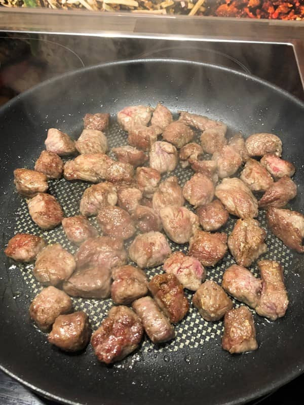 - Fleischstücke in Butterschmalz scharf anbraten und entnehmen