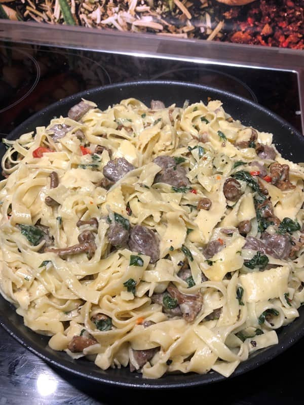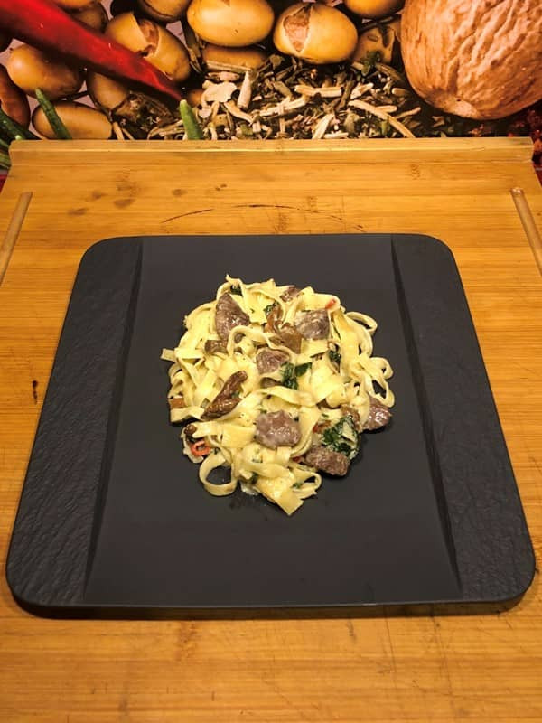 - Rinderfiletspitzen mit Tagliatelle auf den Teller geben