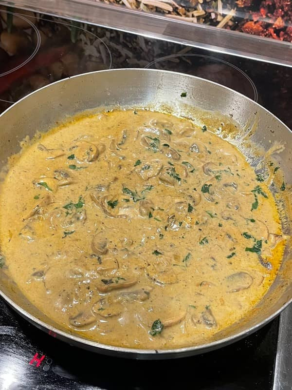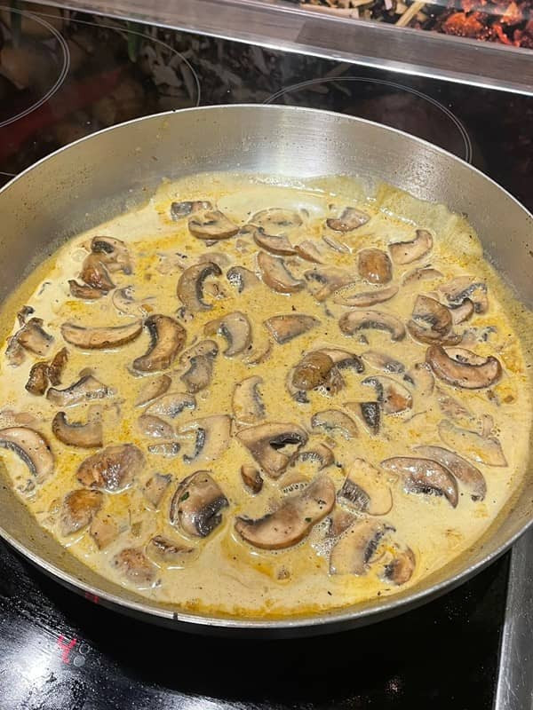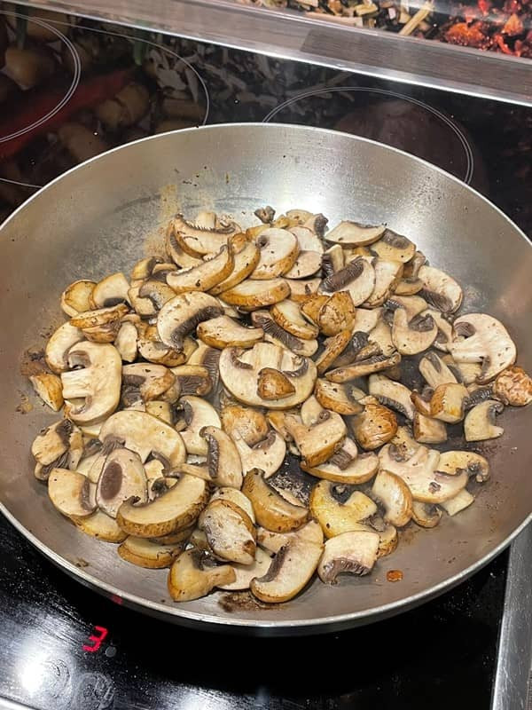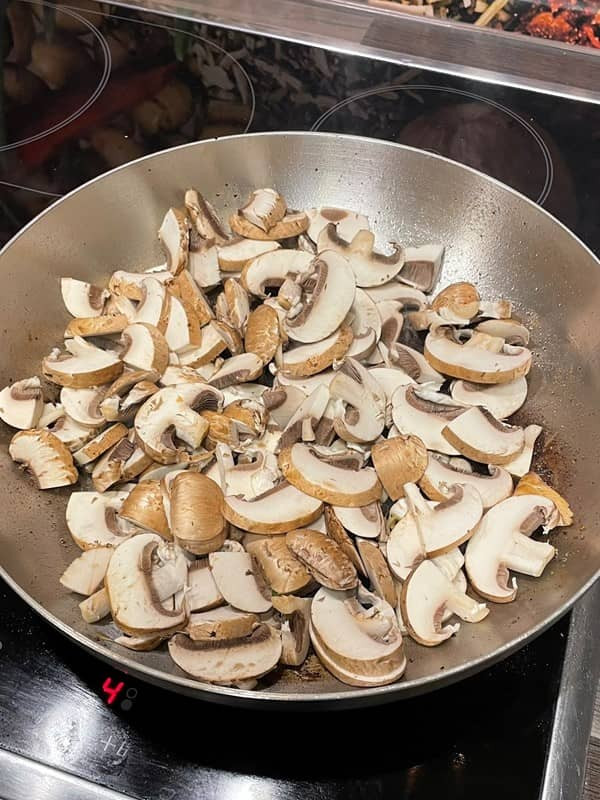 - Nun die Pilze dazu, mit Salz/Pfeffer würzen und solange anbraten bis ihr Wasser verdampft ist