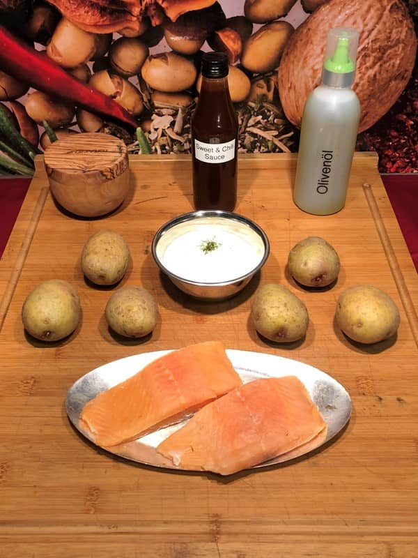 - Lachsschnitte die restlichen 10 Minuten zu den Kartoffeln legen