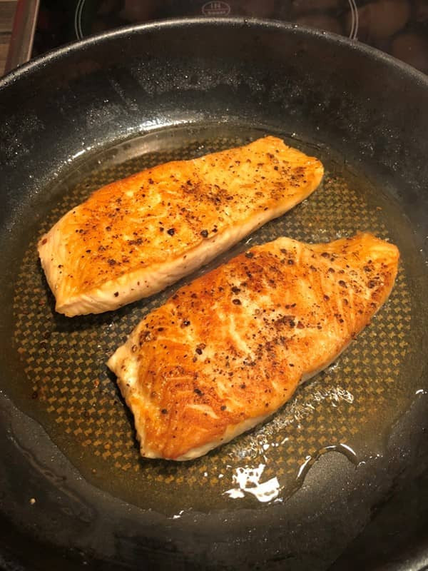 - Lachsschnitte von beiden Seiten in der Pfanne anbraten