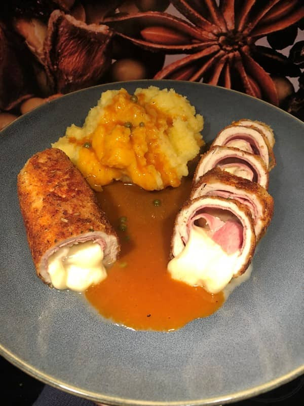 Inspiriert von Chef Jean Pierre. "Chicken Cordon Bleu" ist ein klassisches Gericht, bei dem Hähnchenbrustfilets mit Schinken und Käse gefüllt, paniert und goldbraun gebraten oder gebacken werden. Es wird oft mit einer cremigen Sauce und Beilagen wie Kartoffeln oder Gemüse serviert.