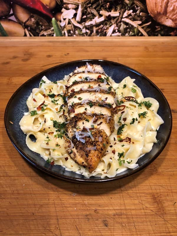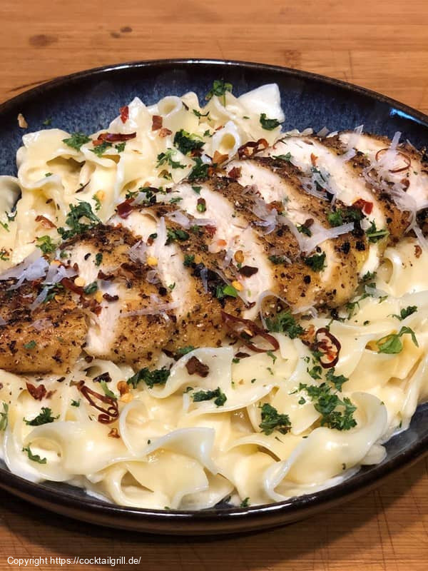 Meine Variante der römischen Köstlichkeit. "Chicken Alfredo" ist ein cremiges Pastagericht, das zarte Hähnchenstücke mit einer reichhaltigen Sauce aus Sahne, Butter und Parmesan kombiniert. Mit Fettuccine serviert, bietet es einen köstlichen Geschmack und eine perfekte Balance aus Würze, Cremigkeit und herzhaften Aromen. Ein italienischer Klassiker!