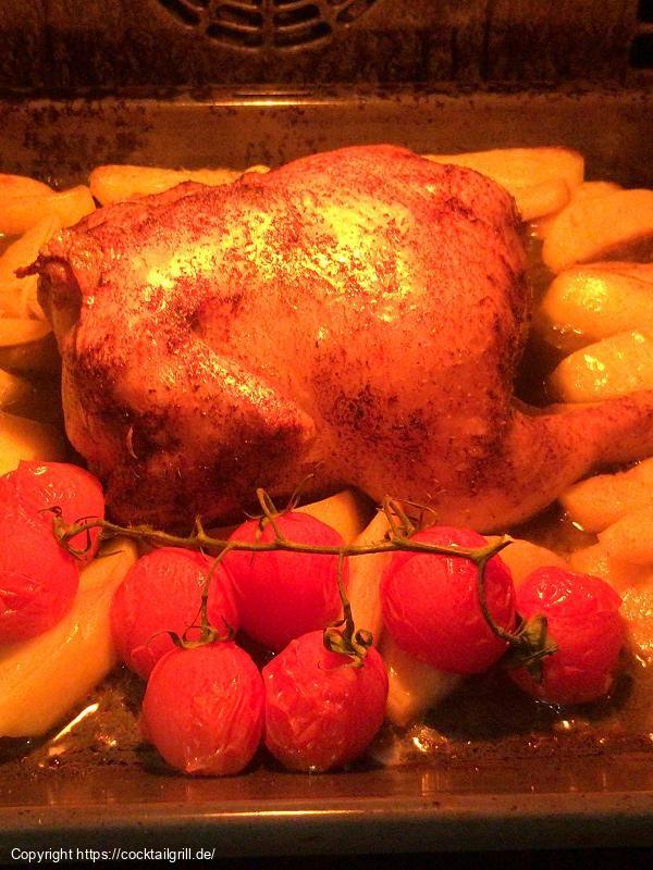 Ein Klassiker aus dem Backofen. "Hähnchen" im Backofen ist ein einfaches und dennoch köstliches Gericht, bei dem ein ganzes Hähnchen mit mariniert und im Backofen mit Kartoffeln gebacken wird. Dadurch entsteht eine knusprige Haut und zartes, saftiges Fleisch. Es ist ein beliebtes Gericht, das sich leicht zubereiten lässt und vielseitig kombinierbar ist.