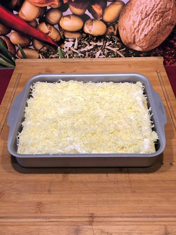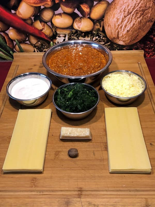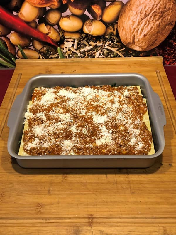 - Zwei Schichten Lasagneblätter, Bolognese und Parmesan