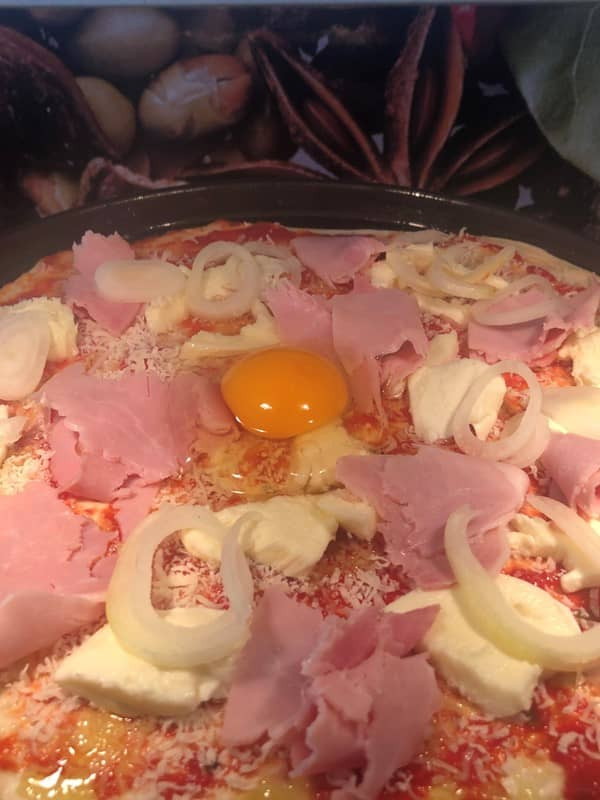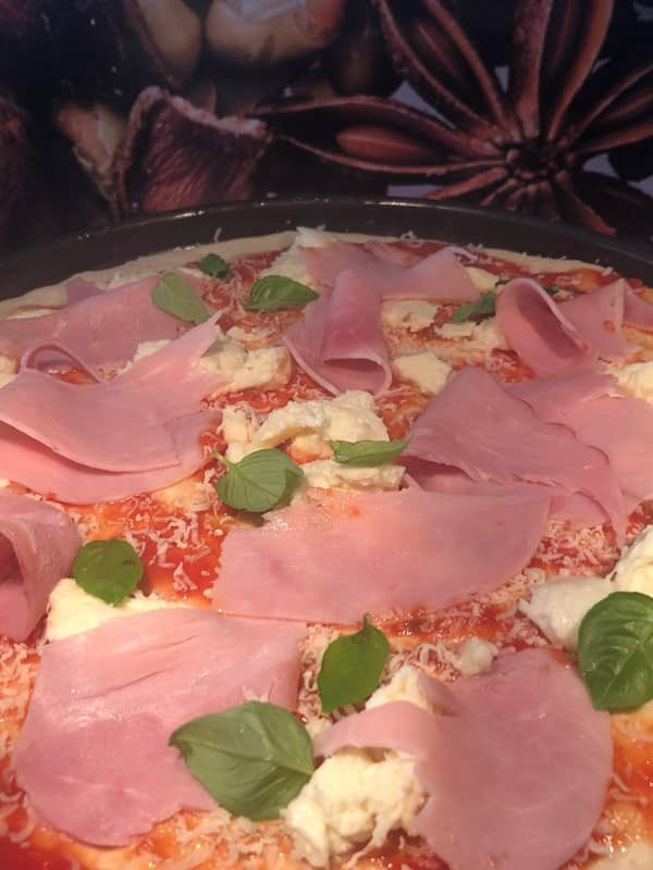 - Salami, Schinken und Pilze darüber verteilen
