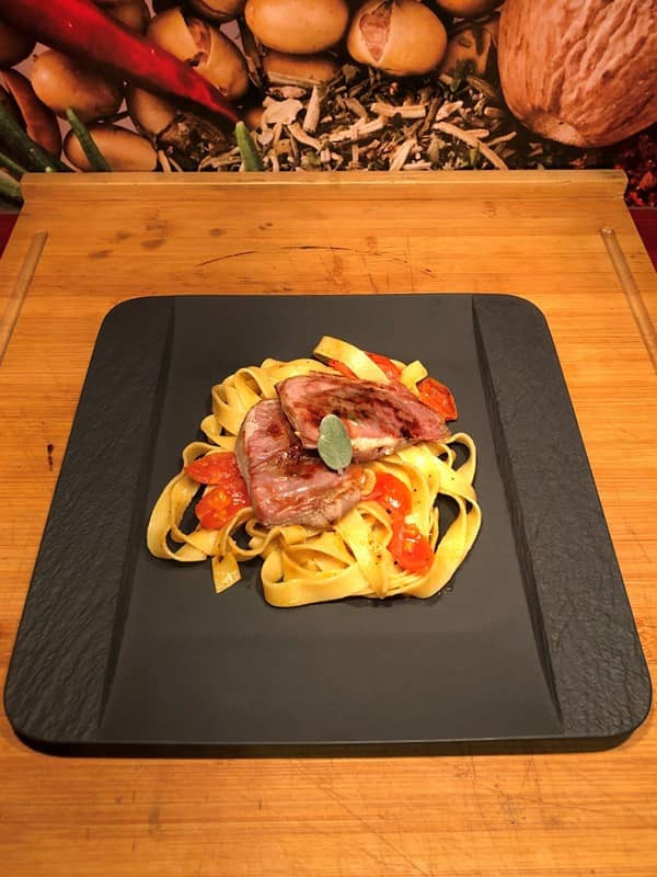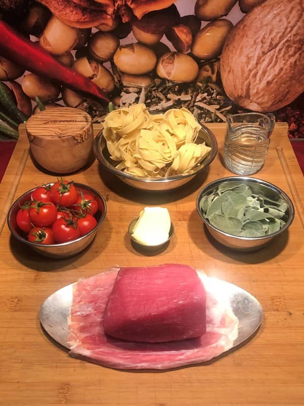 Alla CALLEkocht. "Saltimbocca" ist ein klassisches italienisches Gericht, das hauchdünne Kalbsschnitzel mit Salbei und luftgetrocknetem Schinken umhüllt. Die Schnitzel werden in Weißwein gedünstet, was zu einem zarten, aromatischen Gericht führt. "Saltimbocca" bedeutet "Spring in den Mund", was auf seinen köstlichen Geschmack hinweist.