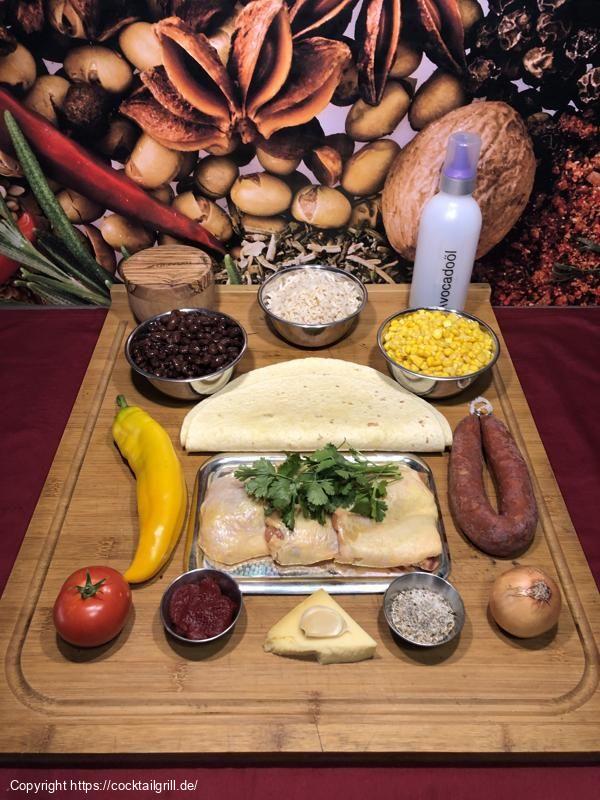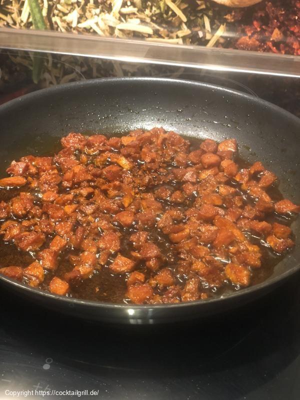 - Hähnchen-Streifen, Chorizzo-Würfel und Käse drüber geben
