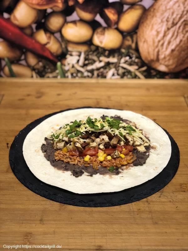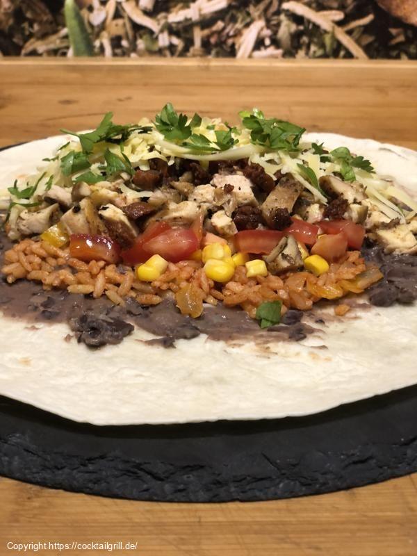 Hähnchen Burrito nach SAM´s Art. "Chicken Burrito" ist eine mexikanische Köstlichkeit. Weiche Tortillas werden mit würzigen Hühnerstreifen, Reis, Bohnen, Käse und frischem Gemüse gefüllt. Dieses herzhafte Gericht bietet eine perfekte Kombination von Aromen und Texturen und ist bei Liebhabern der mexikanischen Küche beliebt.