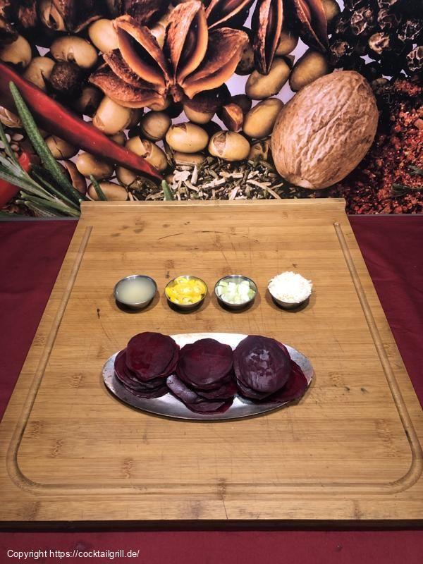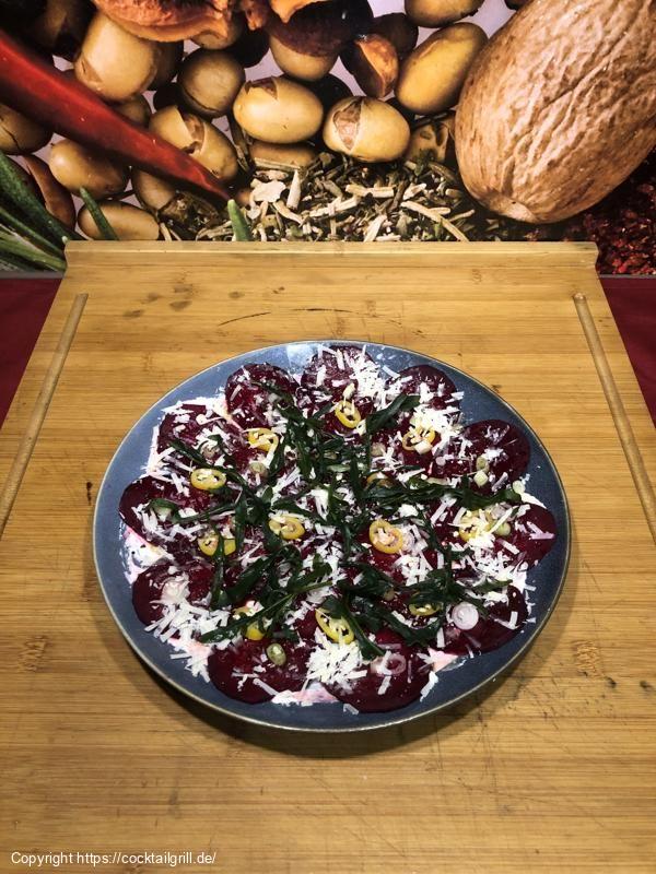 Inspiriert von Steffen Henssler. Rote-Bete-Salat ist eine erfrischende Hauptspeise, Beilage oder Vorspeise, die aus gekochten roten Beten besteht, die in dünnen Scheiben geschnitten und mit einer würzigen Vinaigrette aus Essig, Öl und Gewürzen mariniert werden. Er kann mit Zutaten wie Ziegenkäse, Walnüssen oder Orangenstücken verfeinert werden.