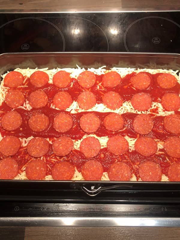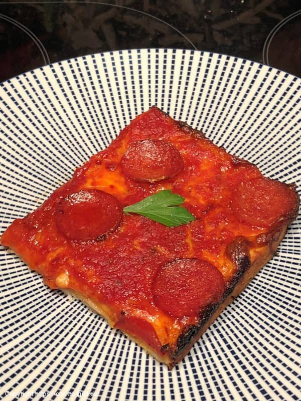 Inspiriert von Sam the Cooking Guy. "Detroit Pizza" ist eine rechteckige, dicke Pizza mit einem luftigen Teig. Sie wird in einer Backform gebacken, wodurch der Käse knusprige Ränder bildet. Oft wird zuerst der Käse, dann die Tomatensauce und danach der Belag auf den dicken Teog gegeben.