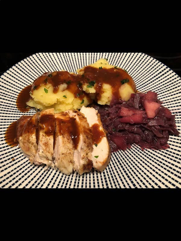 - Kartoffelpüree, Rotkraut und Bratensoße dazu reichen