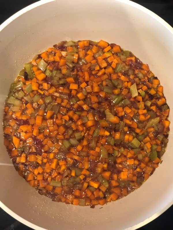 - Zwiebel, Karotten, Sellerie klein schneiden