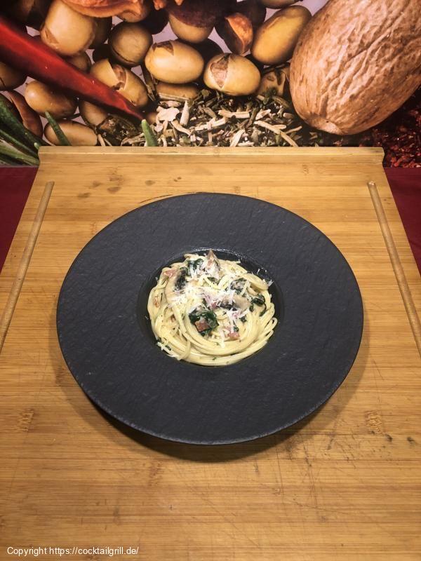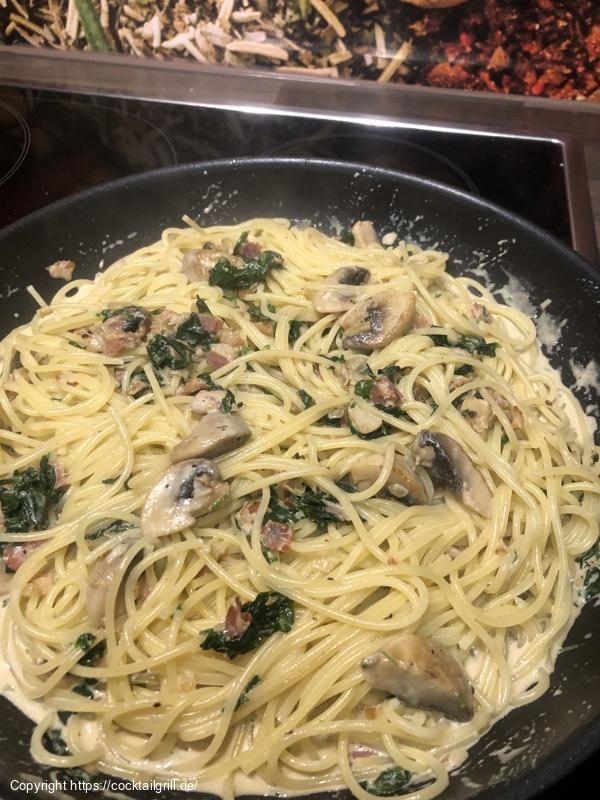 Eine weitere Variante inspiriert von Chef Jean Pierre. "Spaghetti Funghi" ist ein leckeres italienisches Nudelgericht, das aus Spaghetti und einer herzhaften Pilzsauce besteht. Die Pilze werden mit Bacon, Zwiebeln und Knoblauch angebraten und mit Spinat verfeinert. Die gekochten Nudeln werden dann mit der Pilzsauce kombiniert und mit frisch geriebenen Pecorino garniert. Ein wahrer Genuss für Pilzliebhaber.