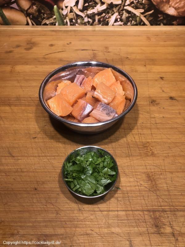 - Die Hälfte der Lachsstücke mit der Gabel zerdrücken