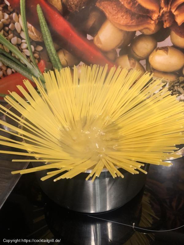 - Wasser aufkochen, salzen und Spaghetti hinein