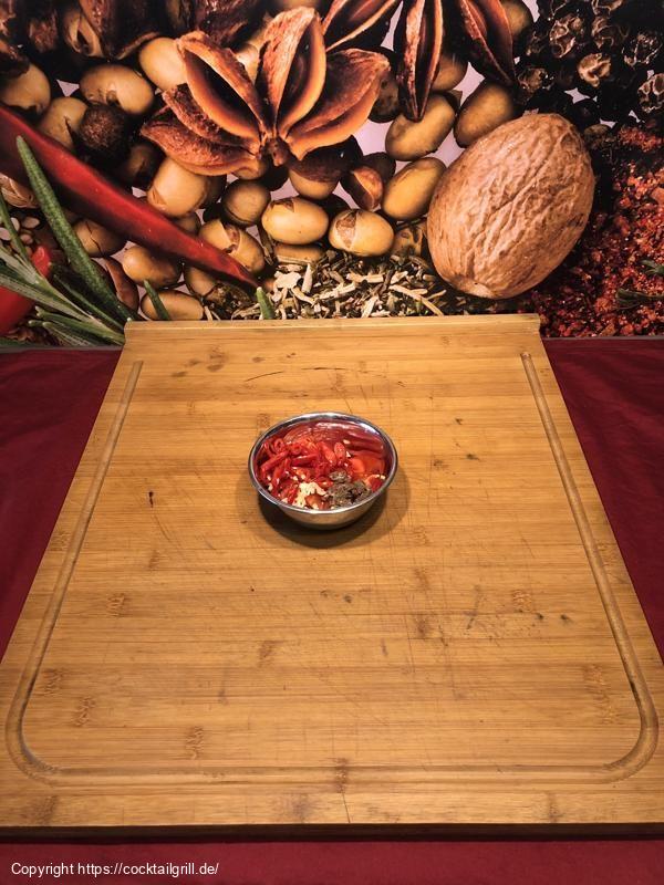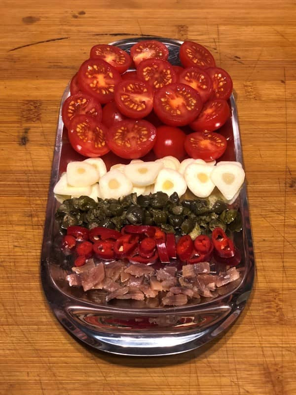 - Peperoni, Knoblauchzehen und Sardellen fein schneiden